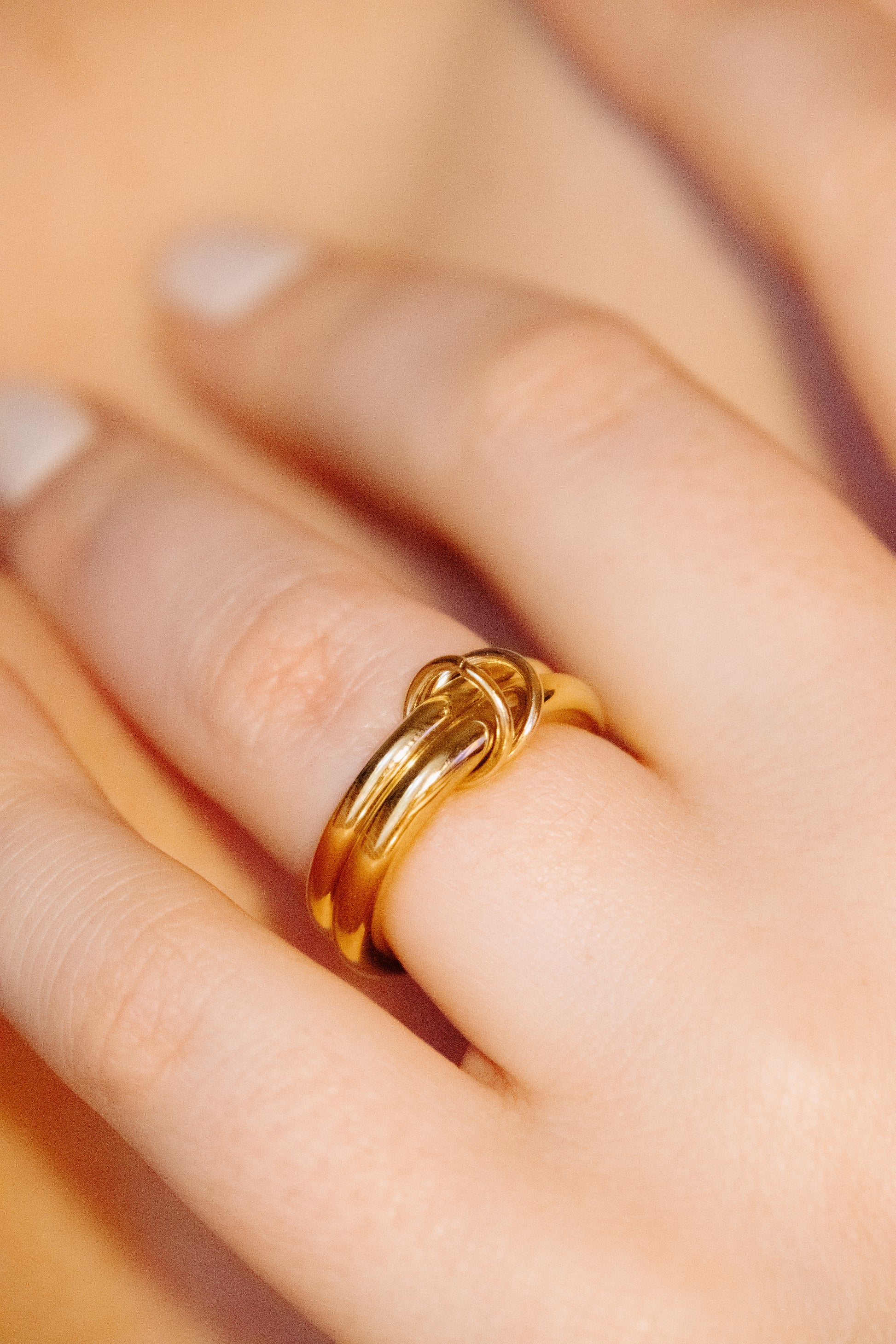 - Stainless Steel 18k Gold and PVD Plated rings with attachment keeping the two bands together.